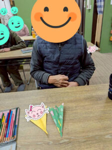 柄のついている折り紙を使ったり、色鉛筆で色を塗ったりと🎨
